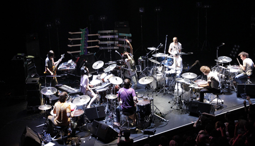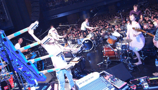 EYヨ、YOSHIMI、YOJIRO、元ブラック・ダイスのヒシャム・バルーチャ、ザック・ヒル(ヘラ)、ブッチー・フエゴ(ピット・アー・パット)、キッド・ミリオンズ(オネイダ)、ジェレミー・ヘイマン(ポニーテイル)、Shinji Masukoの9人編成で行われたこの日のライブ。ミキサーやエフェクト、そして7台のドラムセットが所狭しと置かれたステージにメンバーが登場すると、1曲目から地鳴りのようなビートが鳴り響く。さらに会場の後方よりドラムを乗せた神輿が登場すると、会場のボルテージは一気にMAXへ! 野外では、空をも突き抜けんばかりの開放的なサウンドが、この会場では、天井に跳ね返されて聴く者の上にダイレクトに降り注ぐ。彼らのサウンドが持つ野性味とスケールの大きさが小さなライブハウスだからこそ、より浮き彫りになっているように感じた。