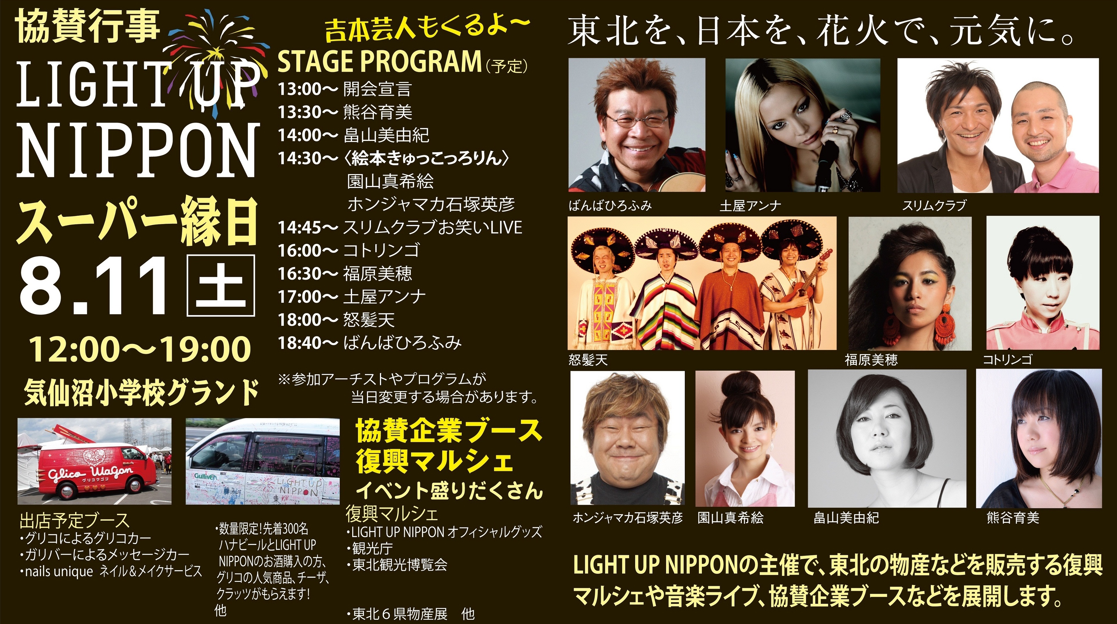 8月11日、今年は東北14ヶ所で行われる花火大会LIGHT UP NIPPON。 そのメイン会場が気仙沼! それを記念してLIGHT UP NIPPONスーパー縁日を気仙沼小学校グラウンドで開催いたします。 日時:2012年8月11日(土)12:00~ メイン会場:気仙沼小学校(宮城県気仙沼市笹が陣3-1) トークライブ:石塚英彦、園山真希絵 音楽ライブ:畠山美由紀、熊谷育美、コトリンゴ、福原美穂、